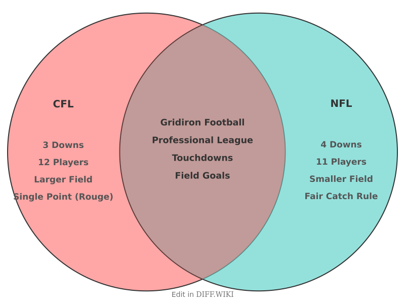 The Canadian Football League (CFL) and the National Football League (NFL) are the highest levels of professional football in Canada and the United States, respectively. While both leagues play a gridiron style of football with shared origins, their modern rulebooks contain significant differences.[1] These distinctions affect gameplay, strategy, and player roles.[2]