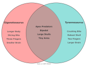 | 08:29, 18 December 2025 | Venn diagram Differences between Giganotosaurus versus Tyrannosaurus comparison.png (file) | 81 KB | Dwg | Venn diagram comparing Differences_between_Giganotosaurus and Tyrannosaurus | |